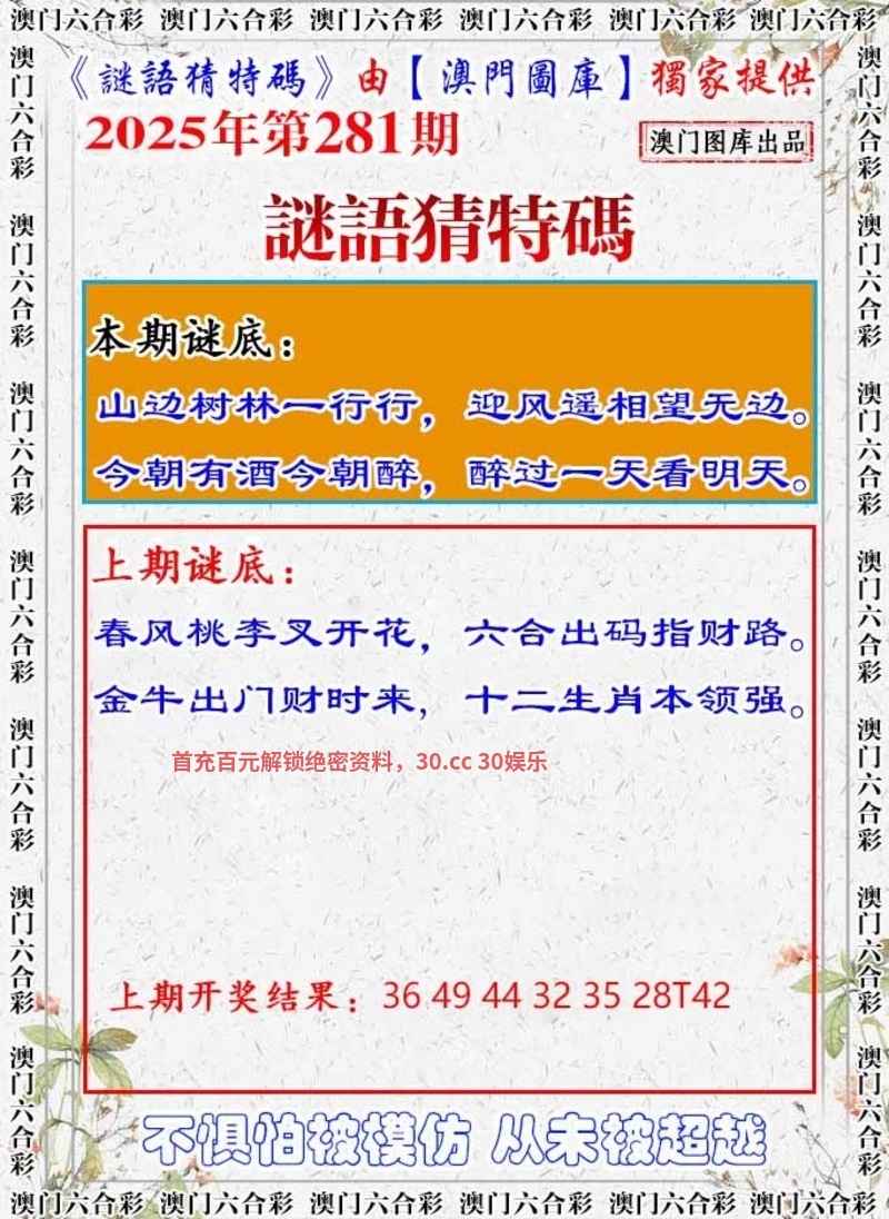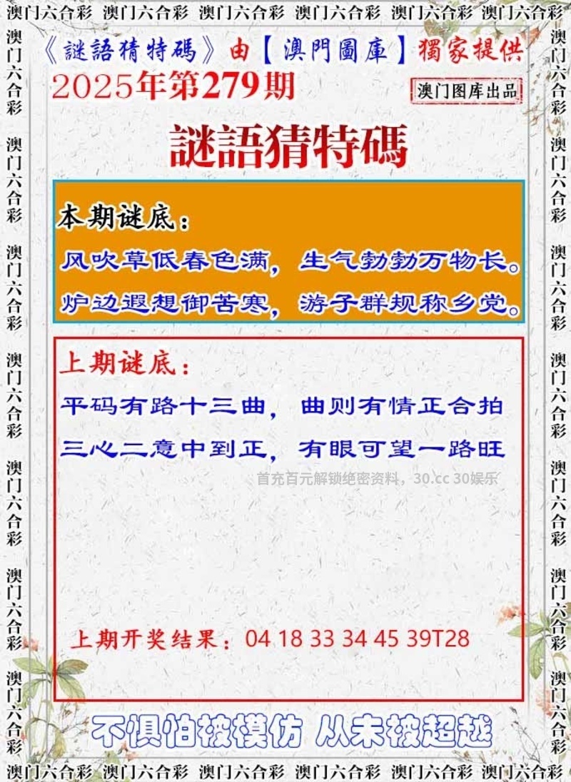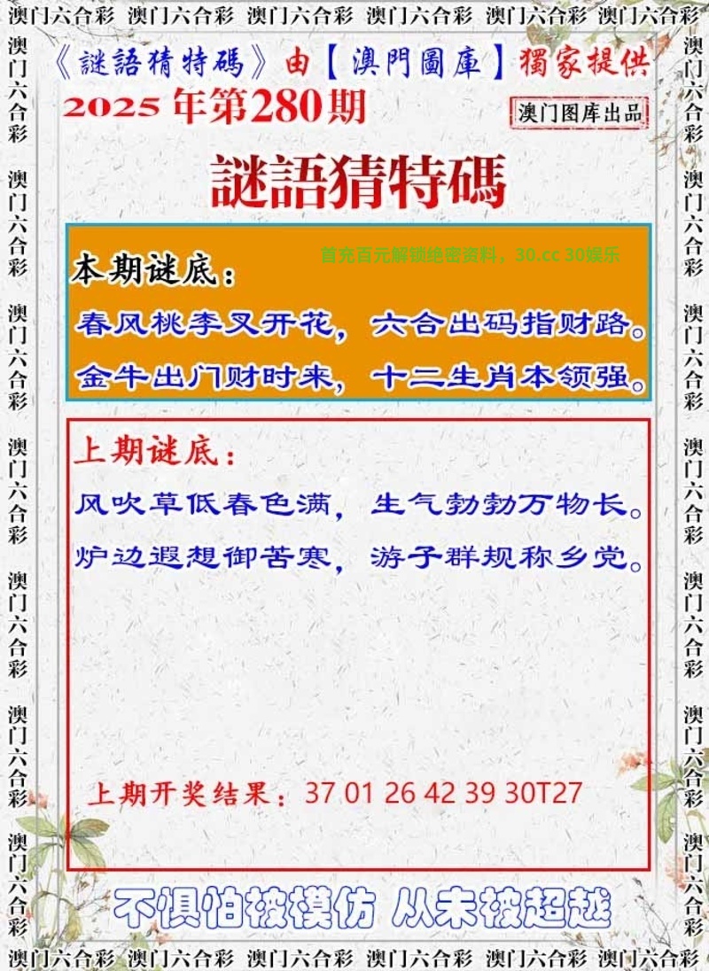 279期:【謎語猜特碼】 风吹草低春色满,生气勃勃万物长。 炉边遐想御苦寒,游子群规称乡党。 七肖:兔牛羊蛇鼠虎龙 四肖:兔牛羊蛇 一肖:兔 |